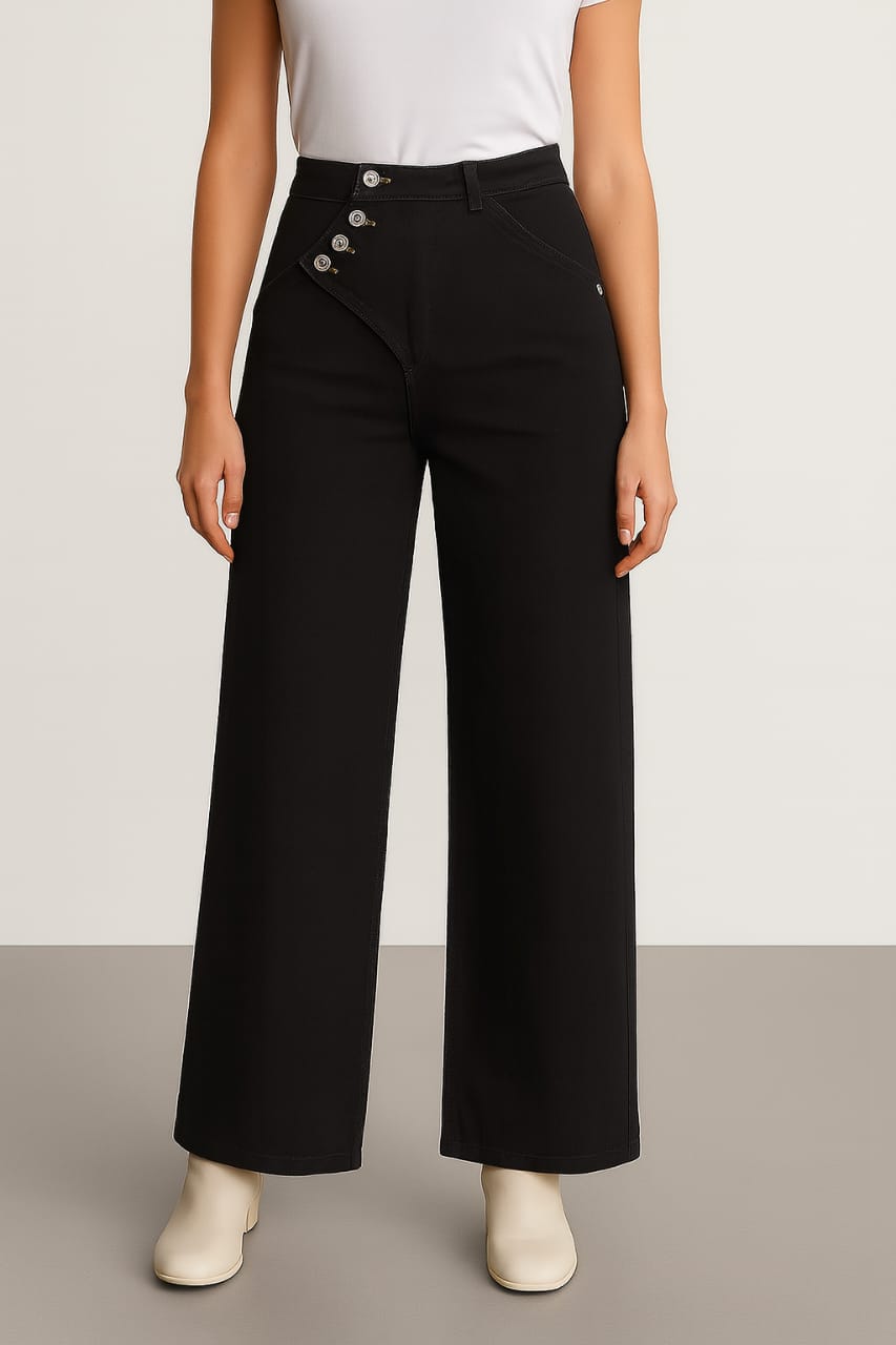 Elegant Turkish heavy denim wide-leg jeans with a unique asymmetrical button closure. Premium fabric, stylish fit, and available in blue and black.