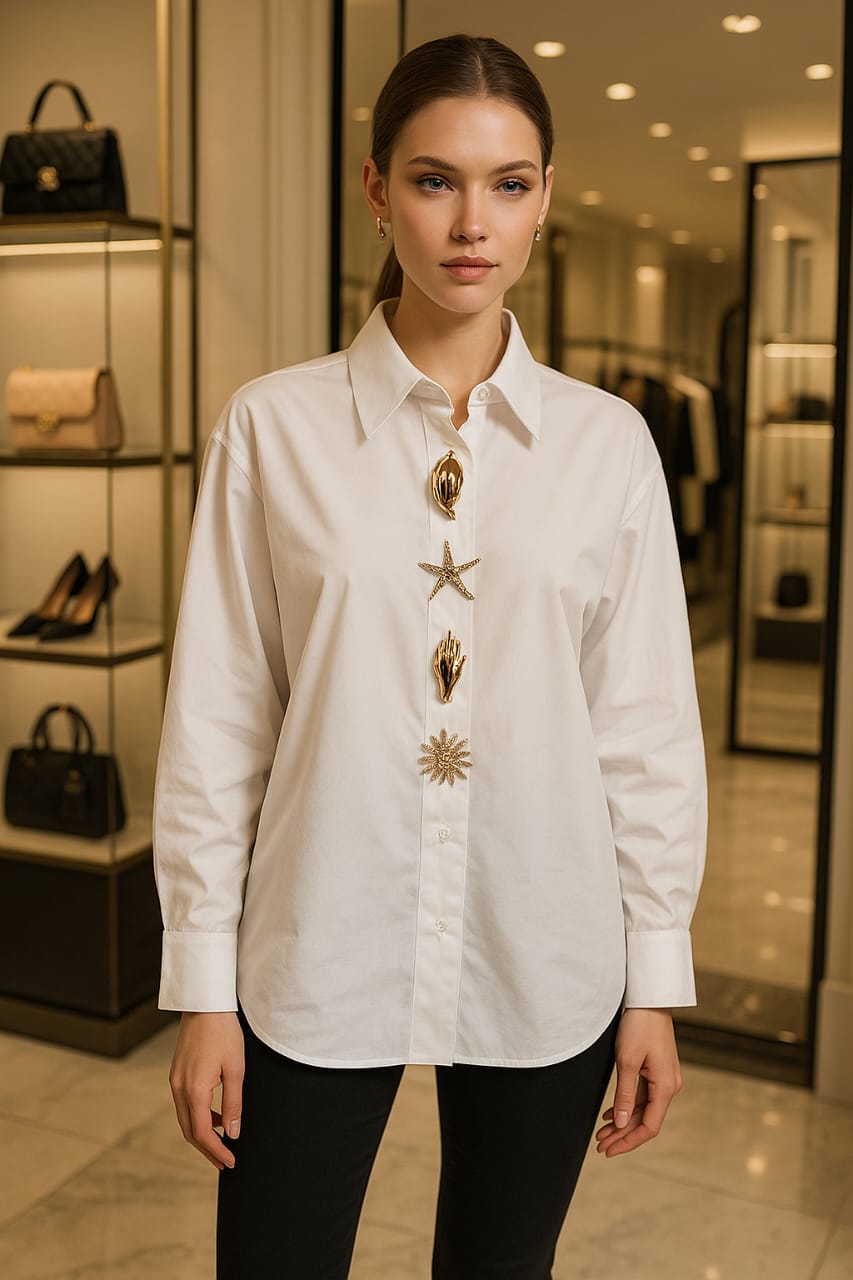 This stunning piece features unique gold embellishments arranged vertically along the button line, giving the classic white shirt a distinctive, high-fashion touch.