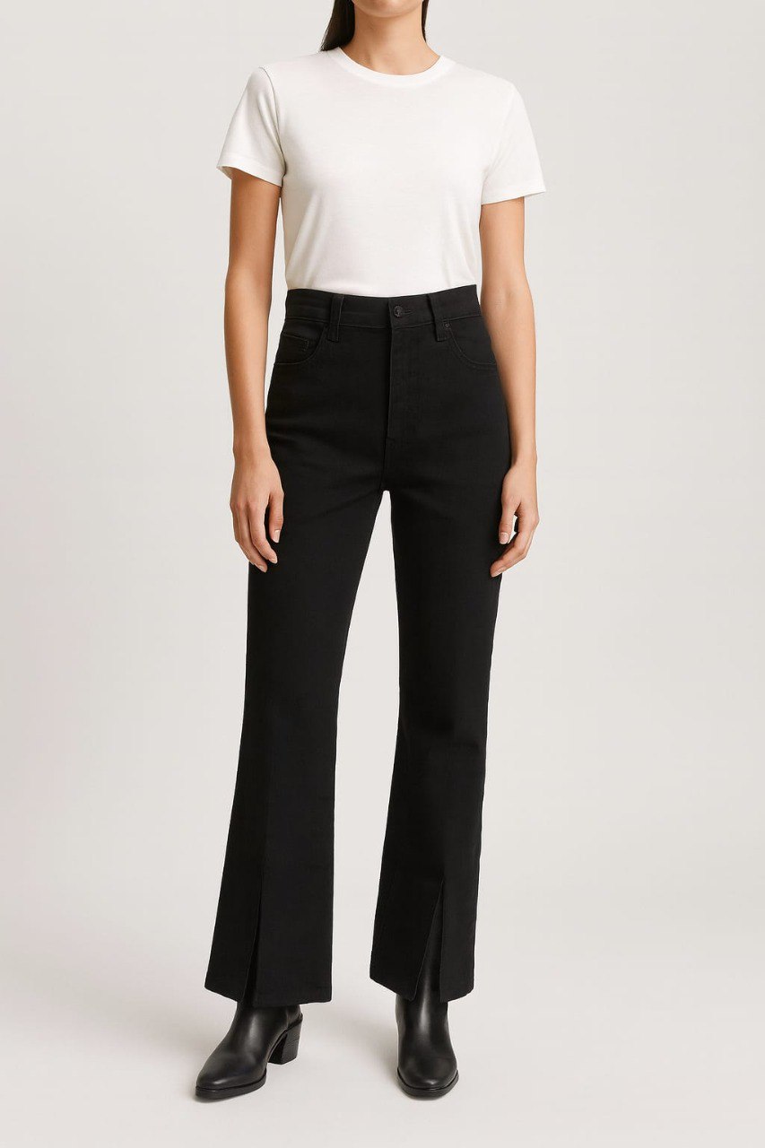 Stylish women’s black jeans featuring a modern front-slit design, premium Turkish denim fabric, perfect stretch, and a flattering straight-leg fit.