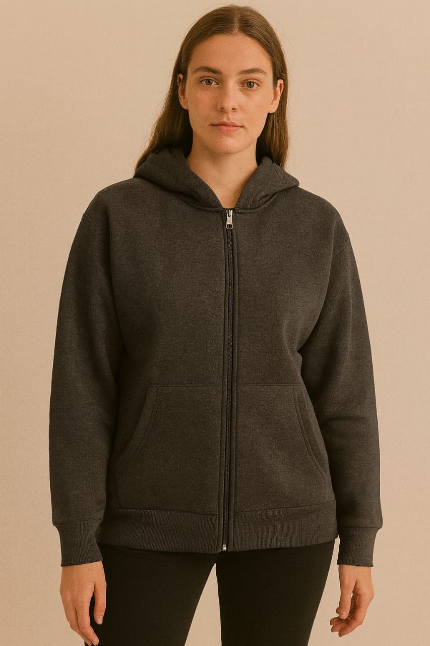 Soft fleece zip-up hoodie with front pockets, offering everyday comfort and a cool casual style.