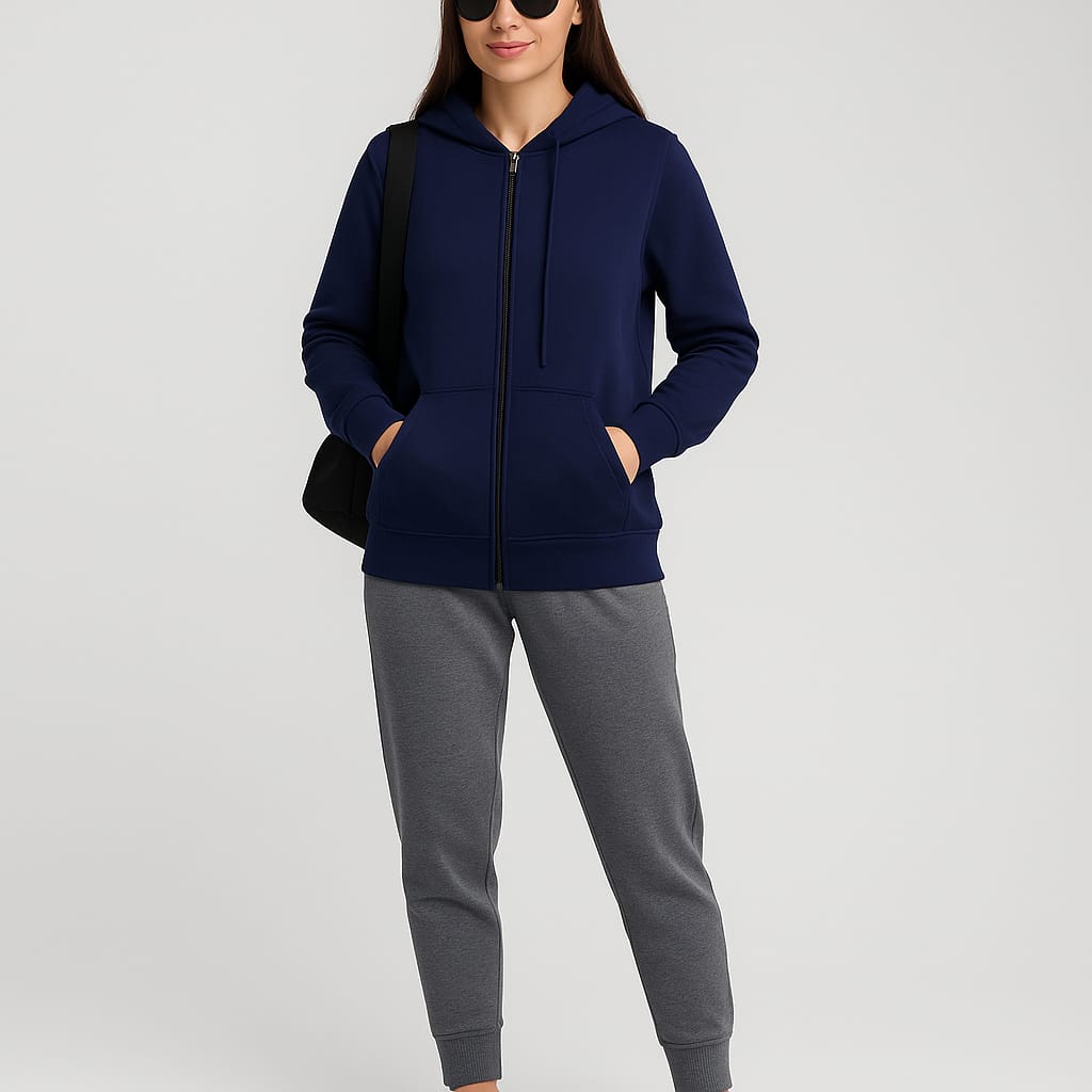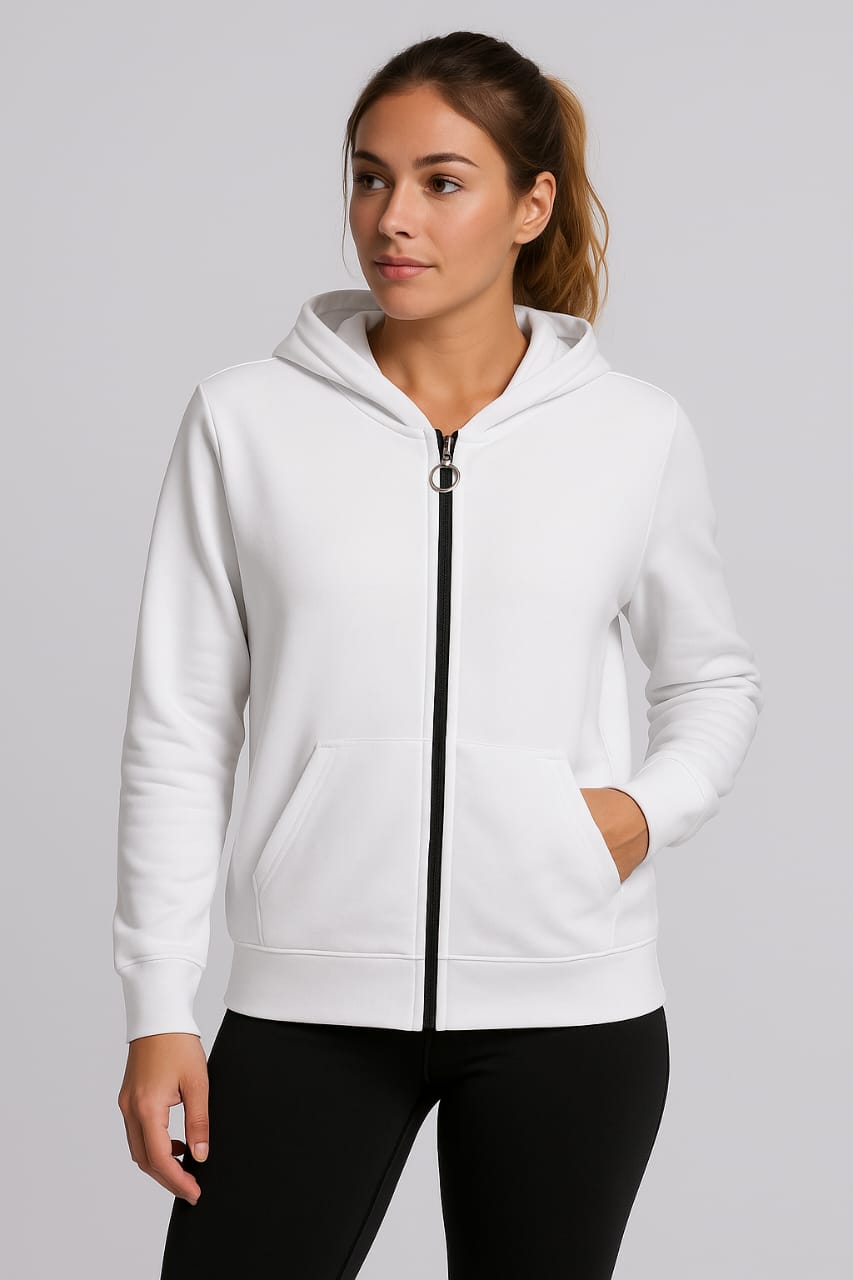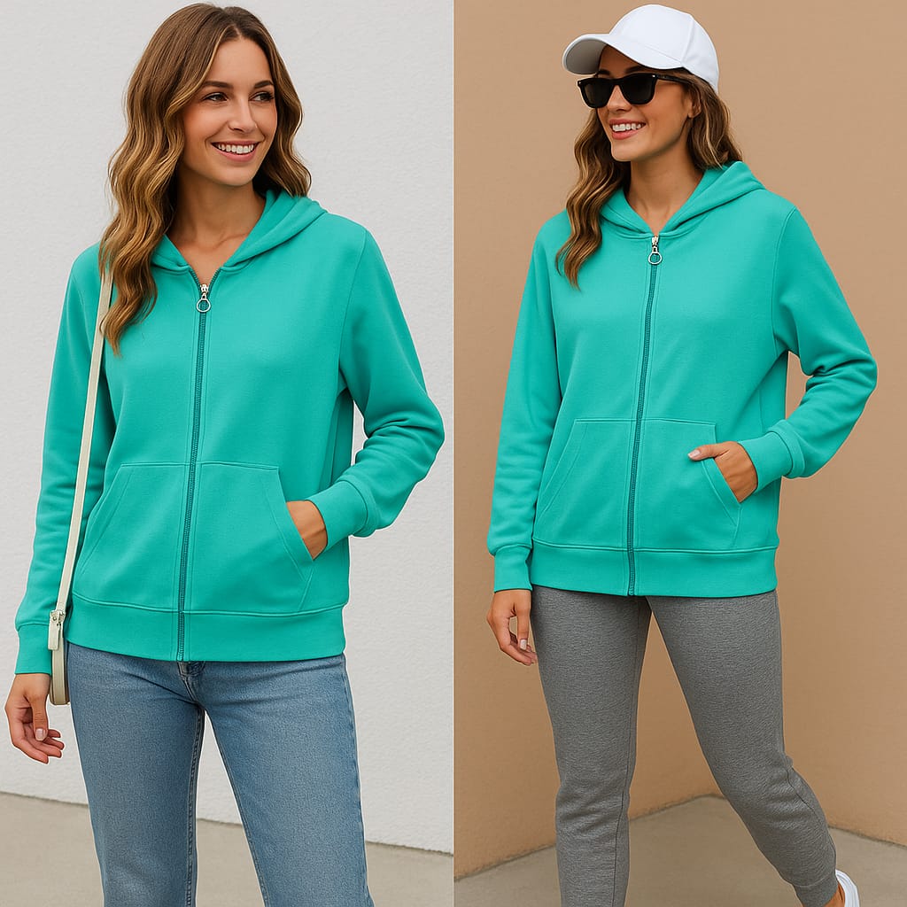 The hoodie features a smooth metal zipper, front pockets, and a clean modern fit that flatters all body shapes. Available in beautiful colors including mint, black, pink, navy, and white, giving you the perfect choice for every style.