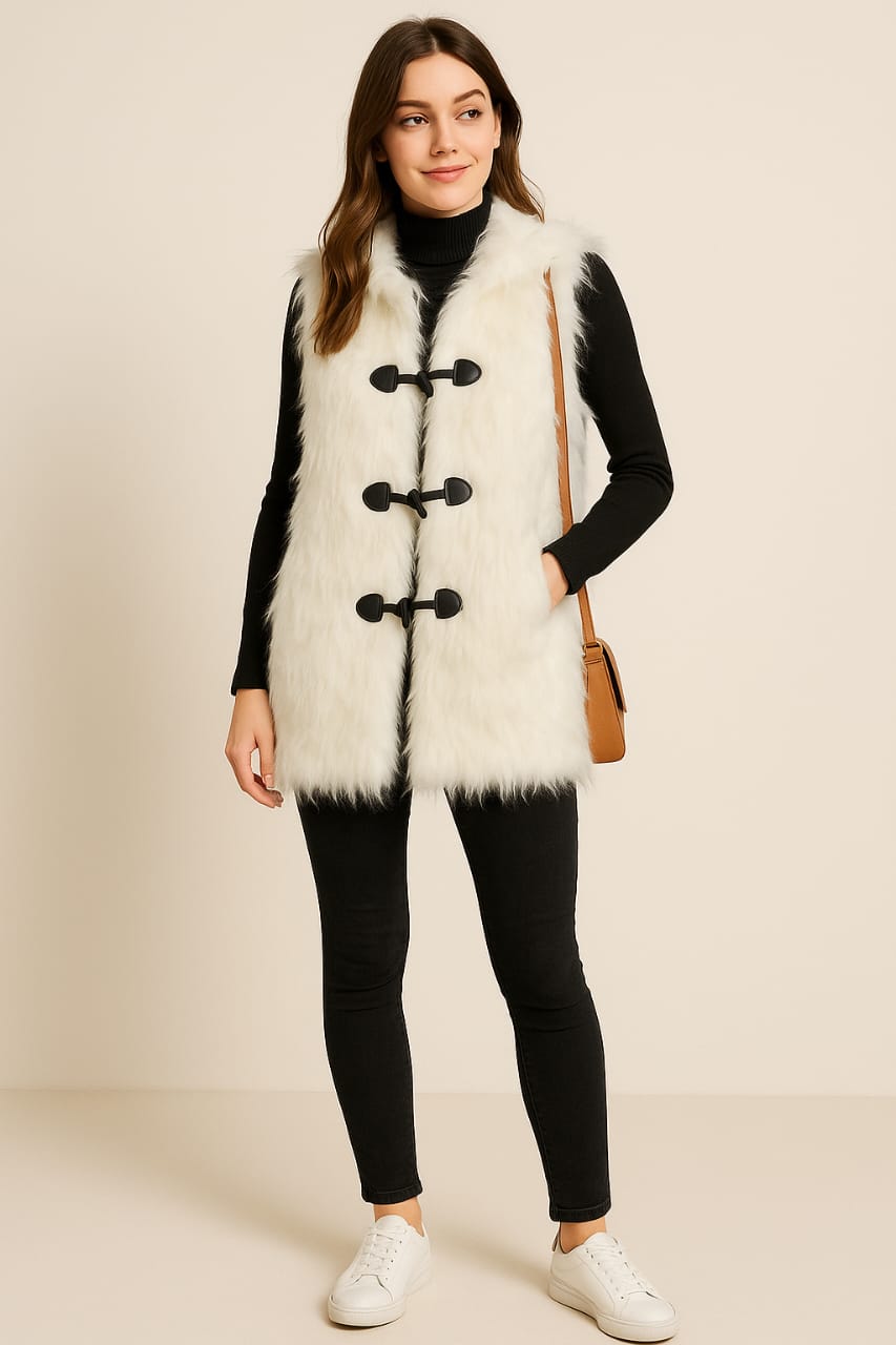 This stylish women’s faux-fur gilet is designed for a classy and modern winter look. Made from high-quality soft faux fur with a smooth inner lining, it delivers warmth, comfort, and a luxurious finish. The toggle-button closure adds a fashionable touch while keeping the vest secure and easy to style.