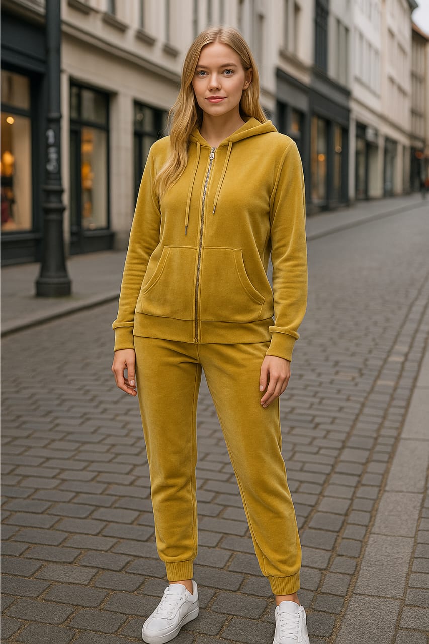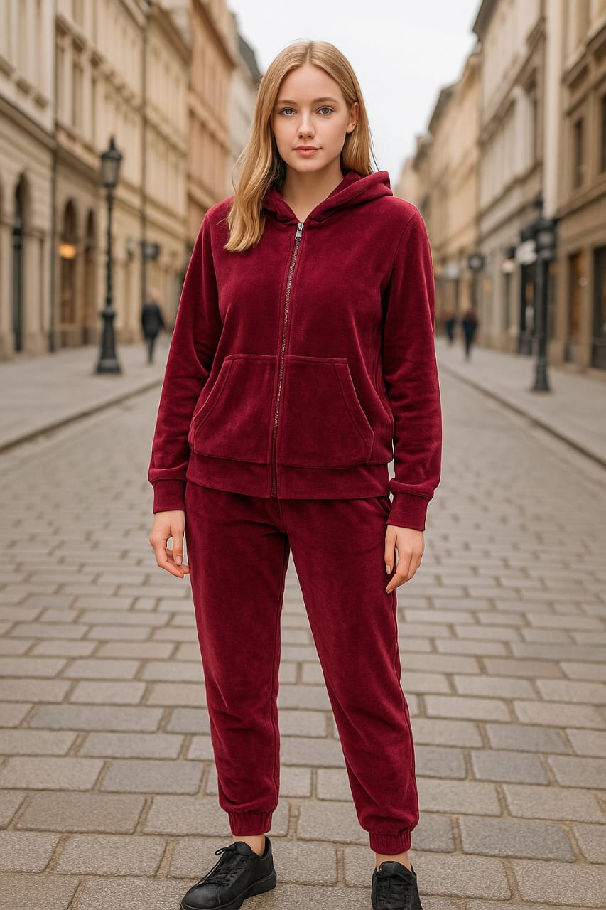Women’s velvet tracksuit made from soft warm Turkish fabric. Smooth touch, warm inside and very comfortable for daily wear. Comes with zipper hoodie and jogger pants. Premium stitching and modern stylish fit. Perfect for winter, home, outings and street style.