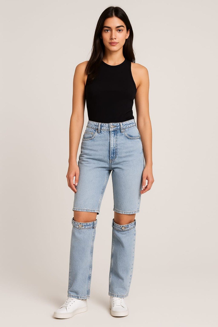 Featuring a unique removable lower-leg design, this piece allows you to switch effortlessly between a long straight-fit jean and a knee-length denim short, giving you two fashions in one.