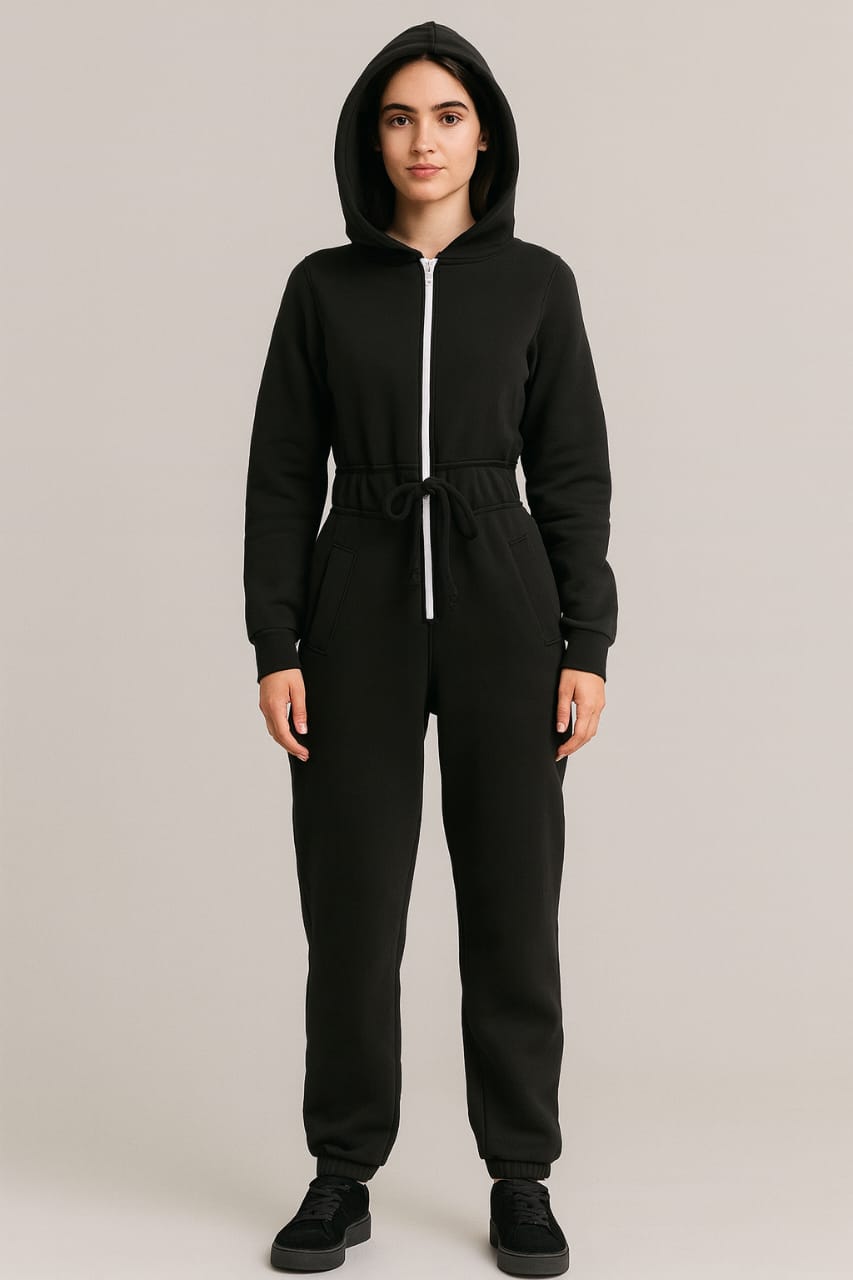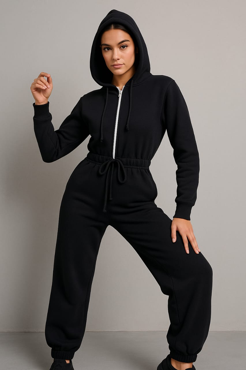 Trendy women’s cotton fleece overall with hood, front zipper, and adjustable waist. Premium Turkish quality and perfect comfort—now on big sale.