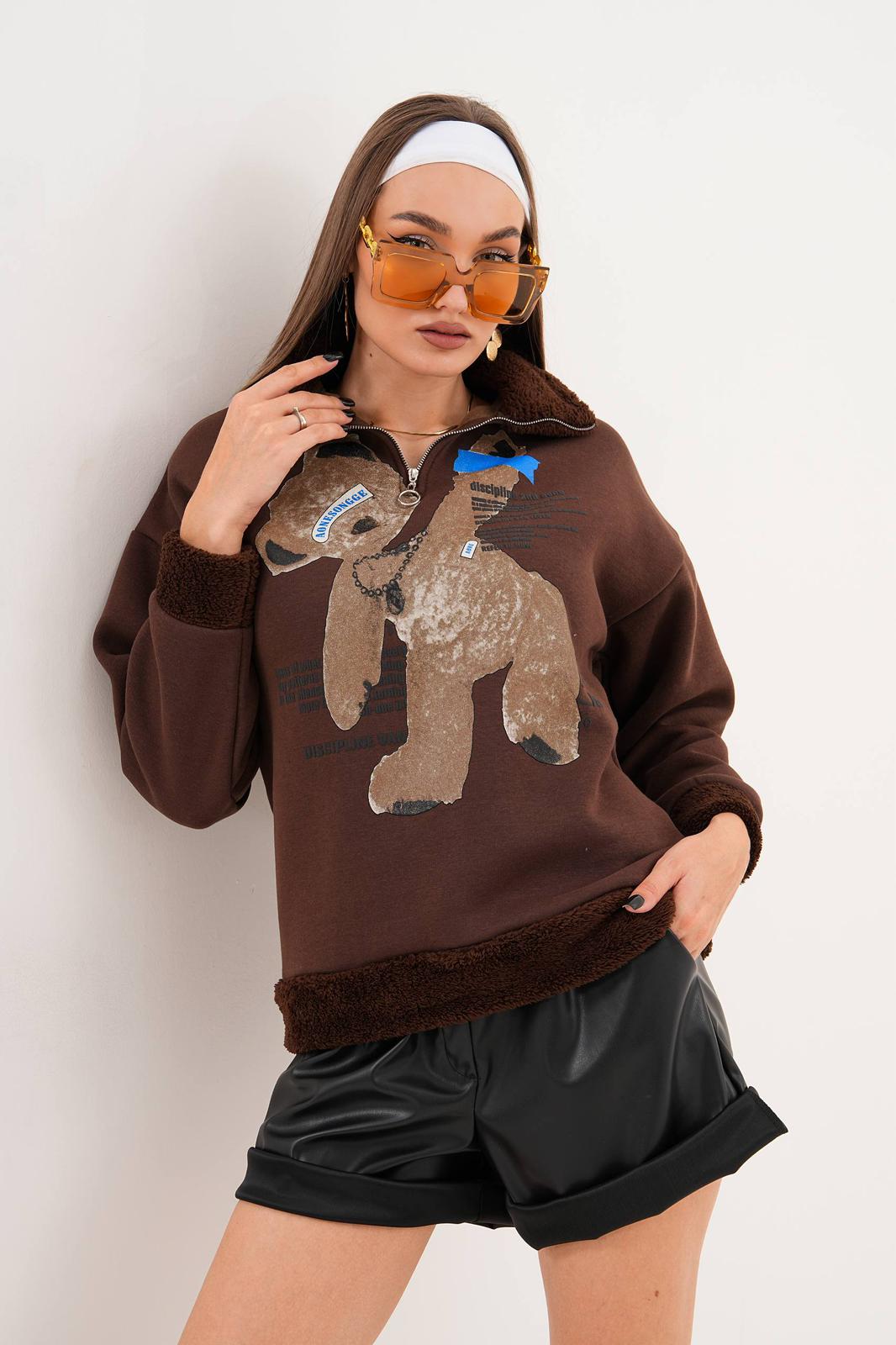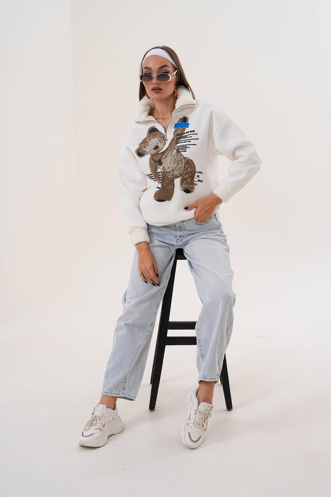 Cozy fleece sweatshirt with teddy graphic, sherpa collar, and half-zip design. Warm, soft, and perfect for winter casual looks.