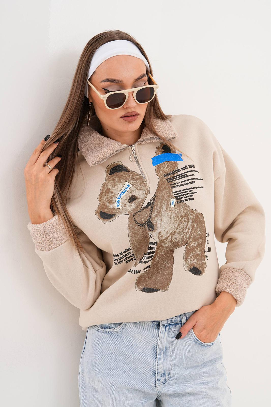 Stay warm and stylish this season with our women’s beige teddy-graphic fleece sweatshirt.